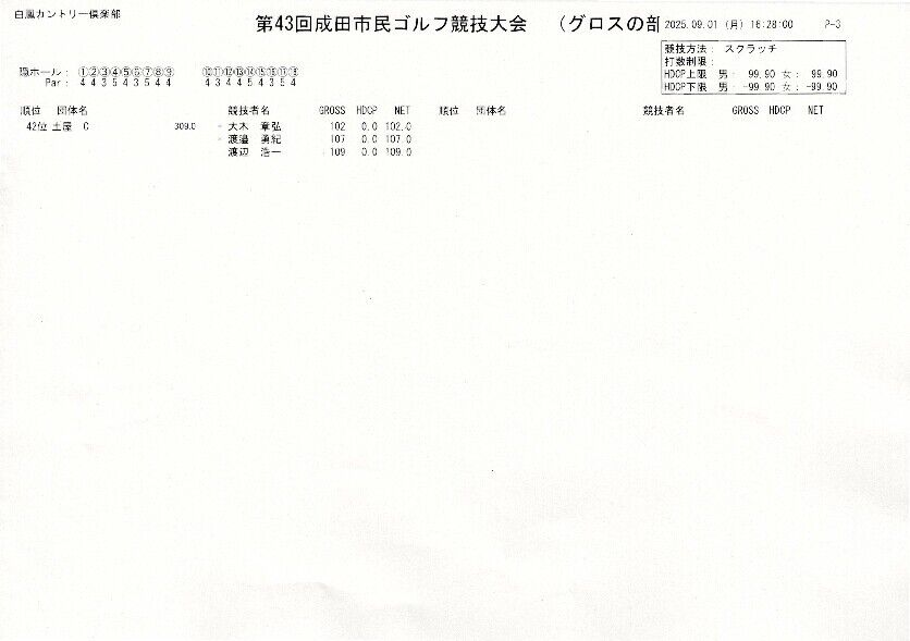 第43回成田市民ゴルフ競技大会 グロスの部 成績一覧 2025年09月06日 成田市アマチュアゴルフ協会より大会の結果報告です!令和7年9月1日(月) 白鳳カントリー倶楽部において、第43回成田市民ゴルフ競技大会が 開催されました。 グロスの部 成績はこちら↓ < 前の記事次の記事 > コメント このブログにコメントするにはログインが必要です。 さんログアウト この記事には許可ユーザしかコメントができません。 コメントフォーム 名前 コメント 評価する リセット リセット 顔 星 投稿する 情報を記憶