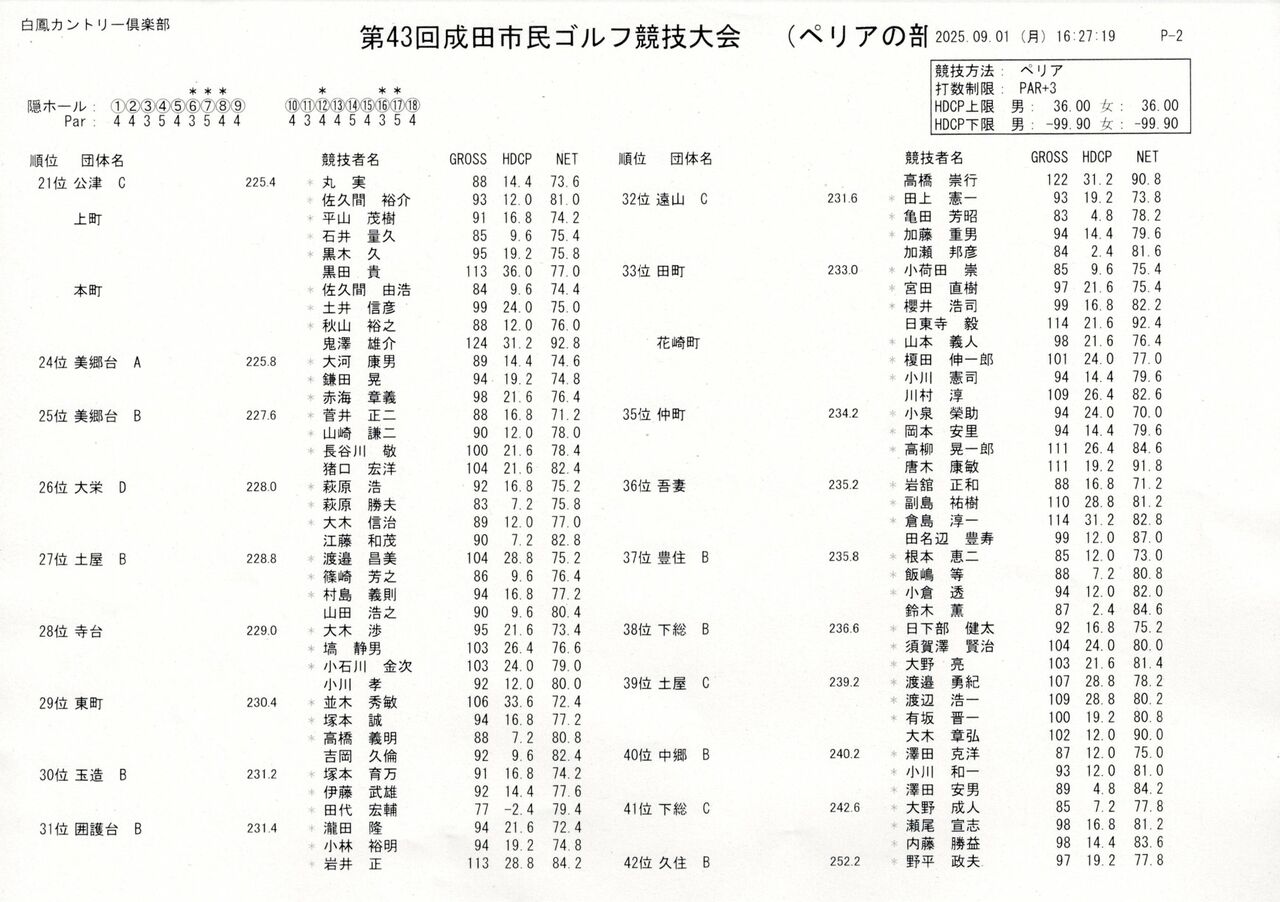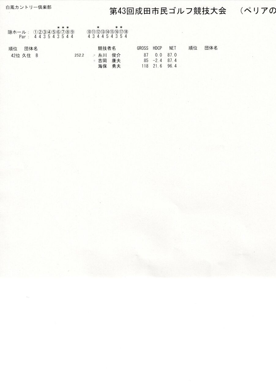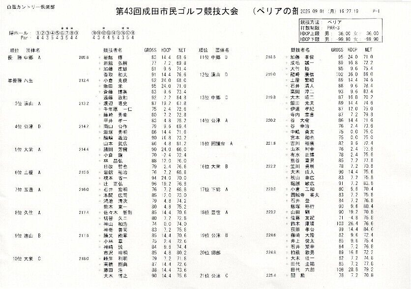第43回成田市民ゴルフ競技 ぺリアの部 成績一覧 2025年09月06日 令和7年9月1日(月) 白鳳カントリー俱楽部にて開催の第43回成田市民ゴルフ競技ぺリアの部の成績はこちら↓ < 前の記事次の記事 > コメント このブログにコメントするにはログインが必要です。 さんログアウト この記事には許可ユーザしかコメントができません。 コメントフォーム 名前 コメント 評価する リセット リセット 顔 星 投稿する 情報を記憶